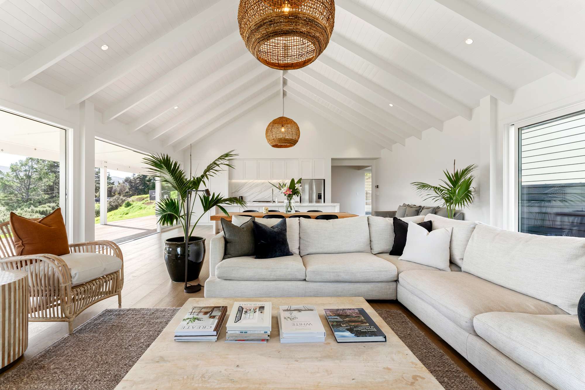 This elegant four-bedroom, two-bathroom residence blends contemporary design with timeless features. Soaring raked ceilings, wide oak floors, and exquisite Calacatta marble finishes reflect the home's refined style and enduring quality. The spacious open-plan layout flows effortlessly to a covered outdoor entertaining area - perfect for long lunches or evenings by the fire.