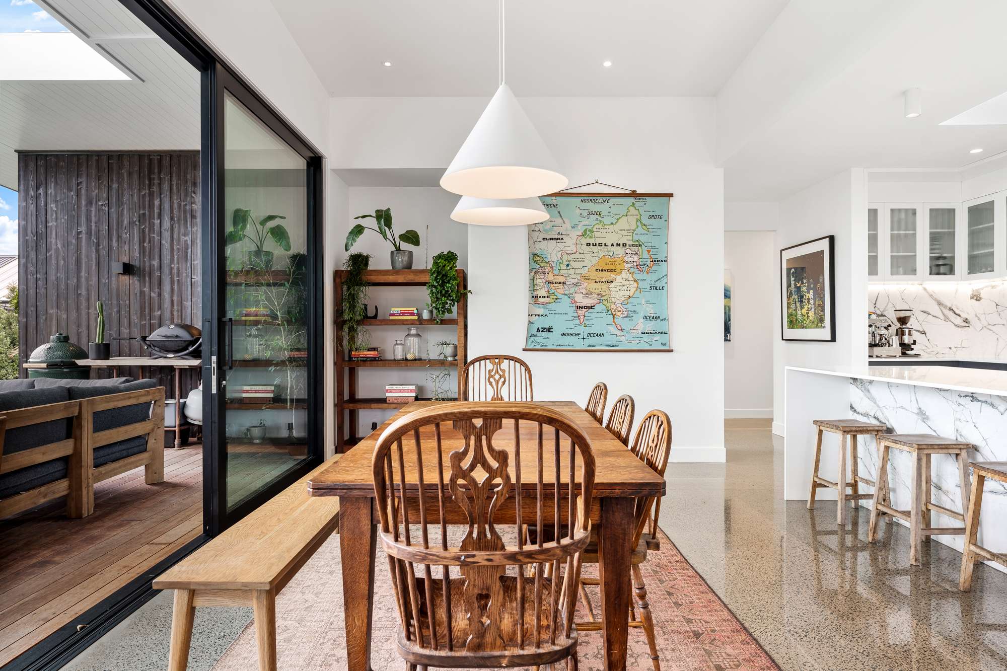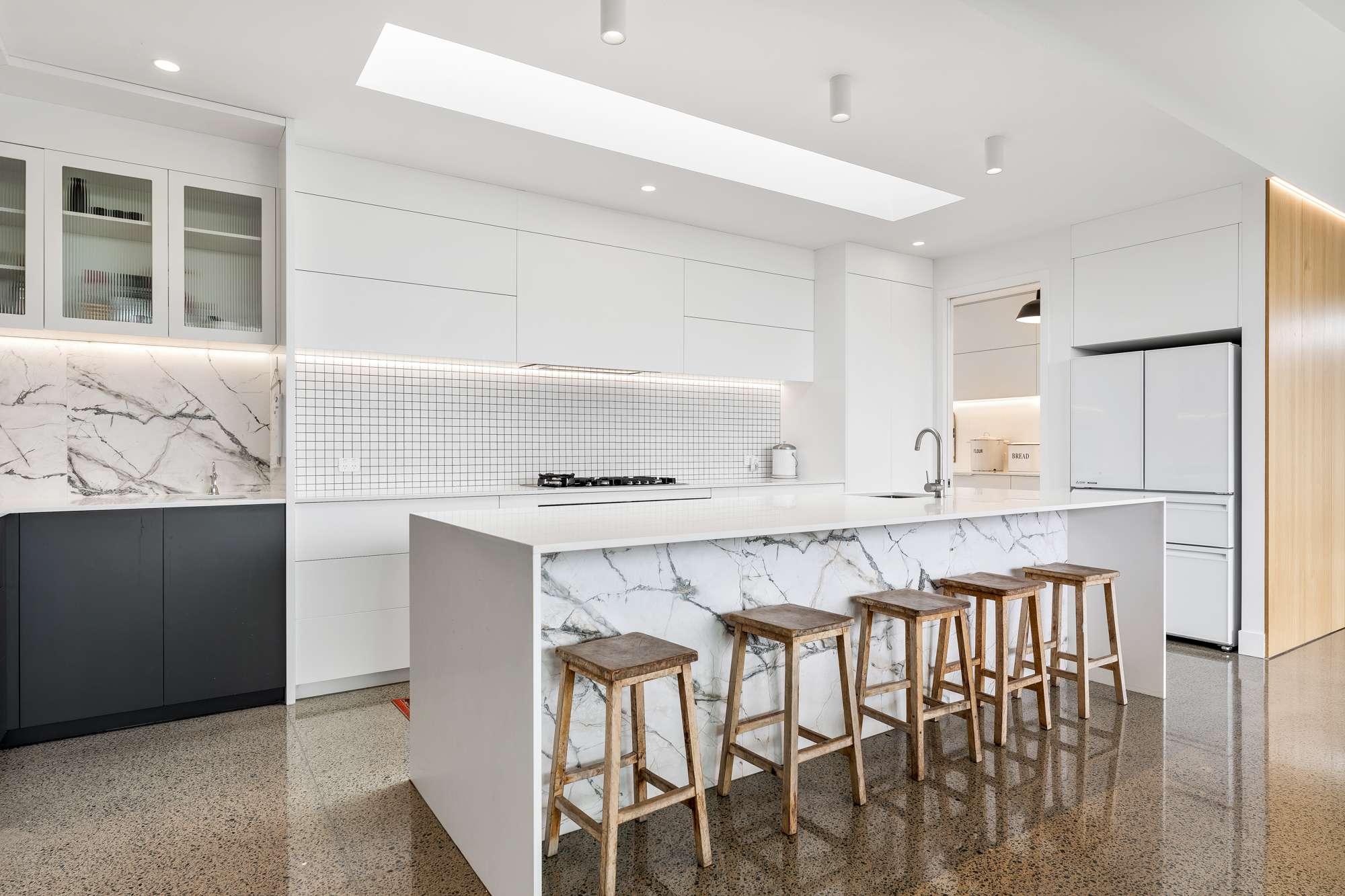 The designer kitchen, complete with a generous scullery, anchors the open-plan living spaces. Two alfresco dining areas extend the home outdoors, capturing all-day sun and creating ideal spots for entertaining or unwinding.