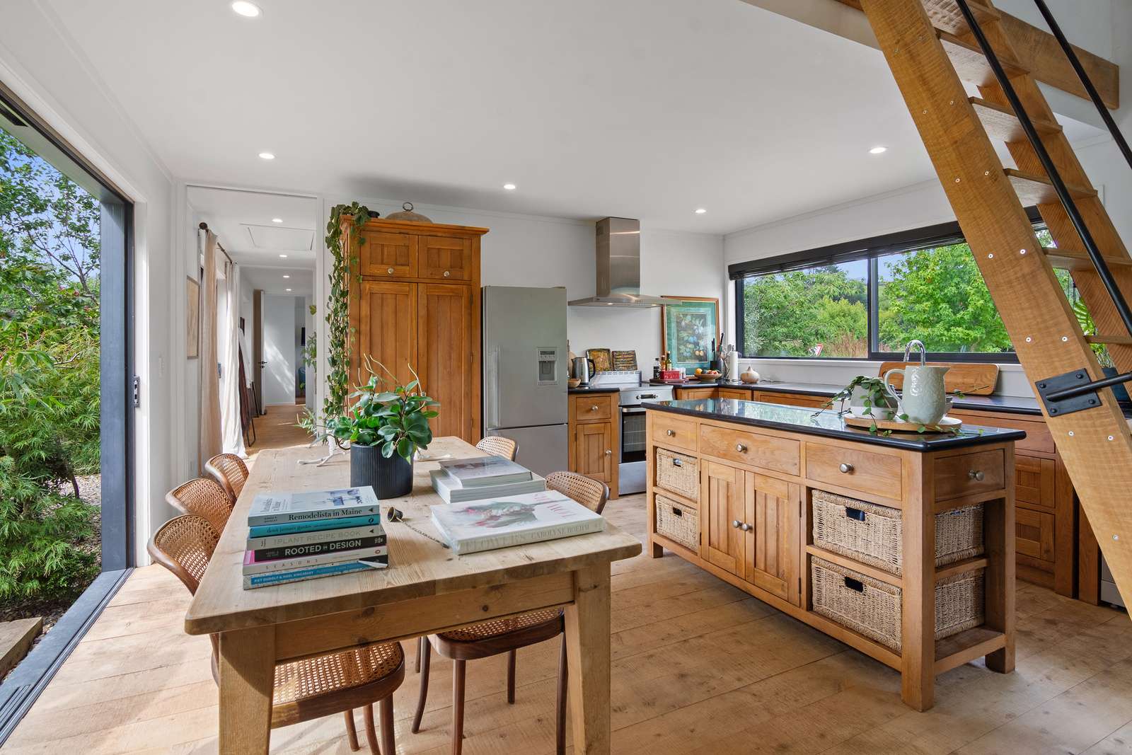 Soaring ceilings and beautiful rough sawn macrocarpa floors immediately set the tone, creating a warm, architectural interior with a wonderful sense of space and calm. The home offers two bedrooms plus a mezzanine, providing flexible accommodation, ideal as a permanent residence, a dreamy holiday escape, or with potential for home and income.